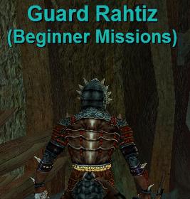 While you're over near Rytan, northeast of him is the banker, Lyndroh. After you've gotten your blessing you will want to run over to the banker and right click him to open your bank. When your bank is open you should see a bag in one of the slots. Take the bag out and place it in your inventory before closing the bank. With all of your training now done you will want to head over to Arias and hail him. Arias will congratulate you and give you a Kobold Skull Charm. You'll want to equip this charm before heading over to Guard Rahtiz at the southern end of camp. You will want to hail Guard Rahtiz to accept your first mission.