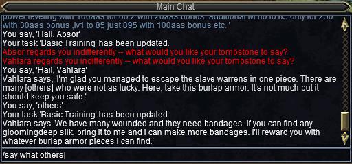 Hail her to continue your quest and she'll give you a piece of armor. Hit "i" to open your inventory and equip it. After you've done that hail Vahlara again and type "/say what others" which will trigger a response.