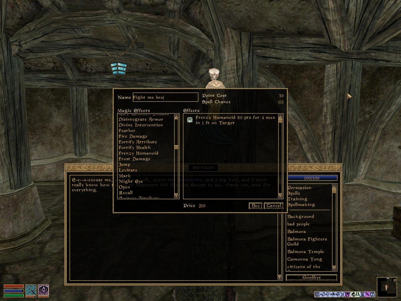 Frenzy Humanoid (001 Fight Me Bro): I try to make a spell with 40 - 70 points in Frenzy Humanoid and have it last for at least 10 seconds. This spell is super useful since it allows you to provoke NPCs into attacking you first avoiding a bounty for assaulting or murdering them.