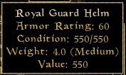 Royal Guard Armor is a set of Medium Armor that was added into the game during the Tribunal Expansion Pack. This armor is worn by every one of King Helseth's guards in the town of Mournhold. You can find King Helseth's guards in the same building that you teleported into from Ebonheart. After you speak with Asciene Rane in Ebonheart to be transported to Mournhold simply run upstairs and you'll find the guards in question.
