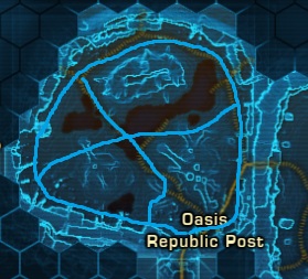 Belsavis is home to a lot of the daily quests at max level and for that reason, as you could imagine it has a fair amount of high level mobs to kill. For the Republic our main daily quest hub on Belsavis is as far north as you can go in "The Tomb" area. Our town up here is called "Oasis Republic Post" and the whole area around this outpost is where you'll be farming. You can see a few different blue lines on the map which is above, they form a bit of a circle and an awkward "X". The circle is the main circuit I recommend following and the two lines of the "X" are where I frequently cut across to gather the materials throughout the middle.