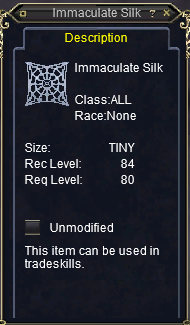 Immaculate Silk is one of the higher level Cultural TS Mats added into the game during the Seeds of Destruction expansion pack. The Cultural Tradeskill materials usually have a low chance (about 5 - 10%) of dropping off various enemies within their level bracket; for Immaculate Silk that means 80 - 100.