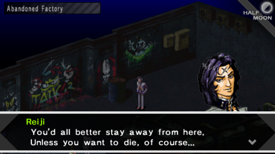 After talking with Reiji's mother you'll want to visit the Judgment 1999 Casino which is inside of the same mall. Inside this Casino you'll want to speak with the Blonde man (pictured above) who mentions a guy with a scar on his head. Once you've seen this dialogue you're now flagged and can meet Reiji inside of the Abandoned Factory (pictured below).