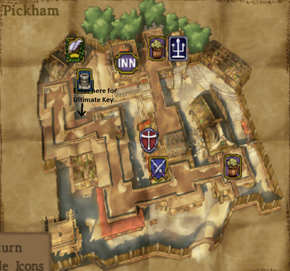 Zoom back to Pickham since this is the first town that we passed which had treasure chests and doors you could open with the Ultimate Key. In the northwestern portion of the town there'll be a door hidden in a little nook south of the well and the item shop. Enter this door and in the hallway you'll want to go through the gated door where there's four treasure chests.